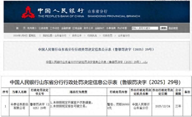 公告显示,中泰证券因未按照规定开展客户尽职调查、未按照规定报告可疑交易,被中国人民银行山东省分行予以警告,并罚款869000元。