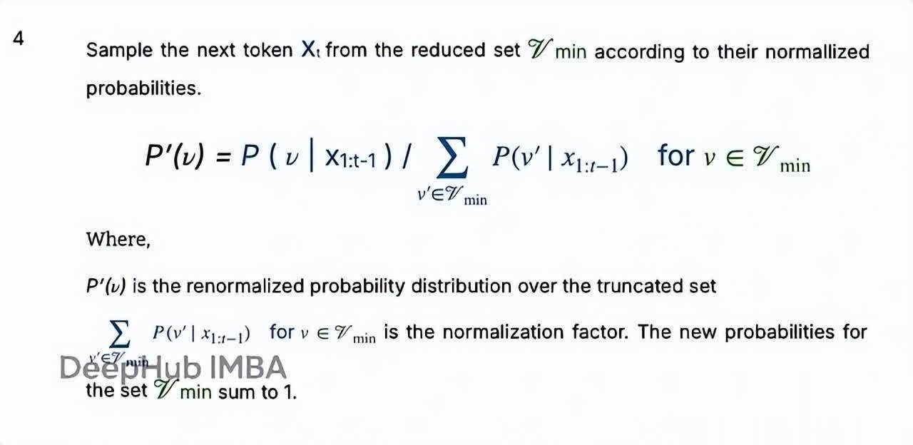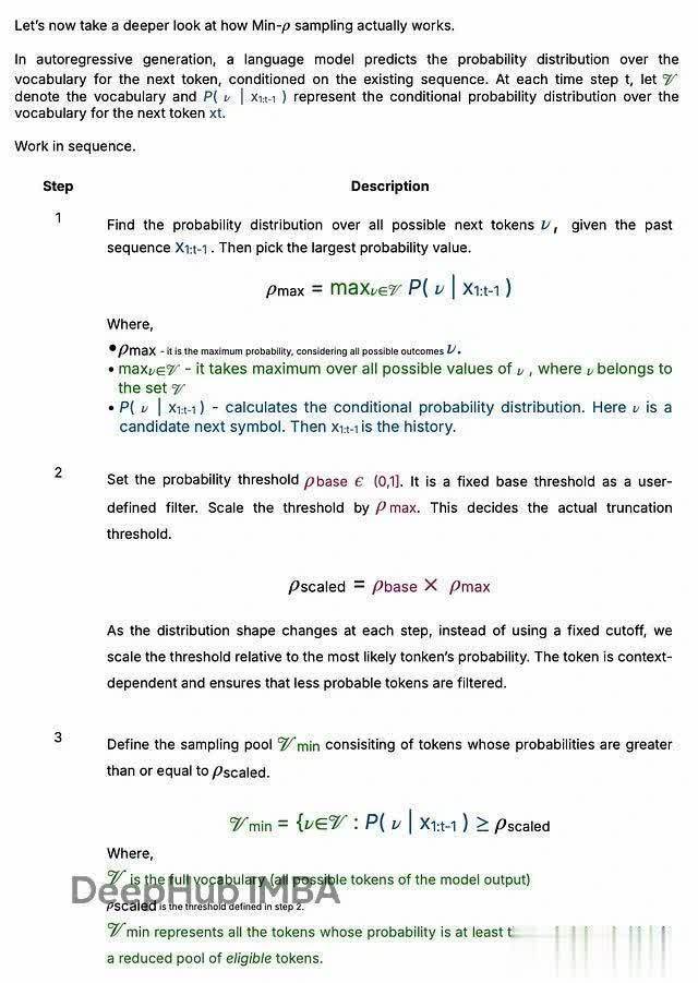 Top-p(核采样)动态选择累积概率超过阈值 p 的最小 token 集合。不过在高温度下这种方法也可能产生重复或不连贯的文本。p 值低了太保守鼎宝融,p 值高了又太冒险。